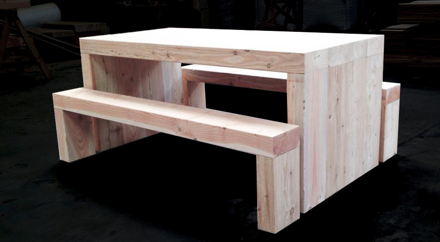 Our tables comes in two version; a longer bench version where the length matches the length of the table, and a short bench version where the length is approximately 300mm shorter to allow it to fit snugly underneath with a little breathing room allowing for a smaller footprint when not in use.