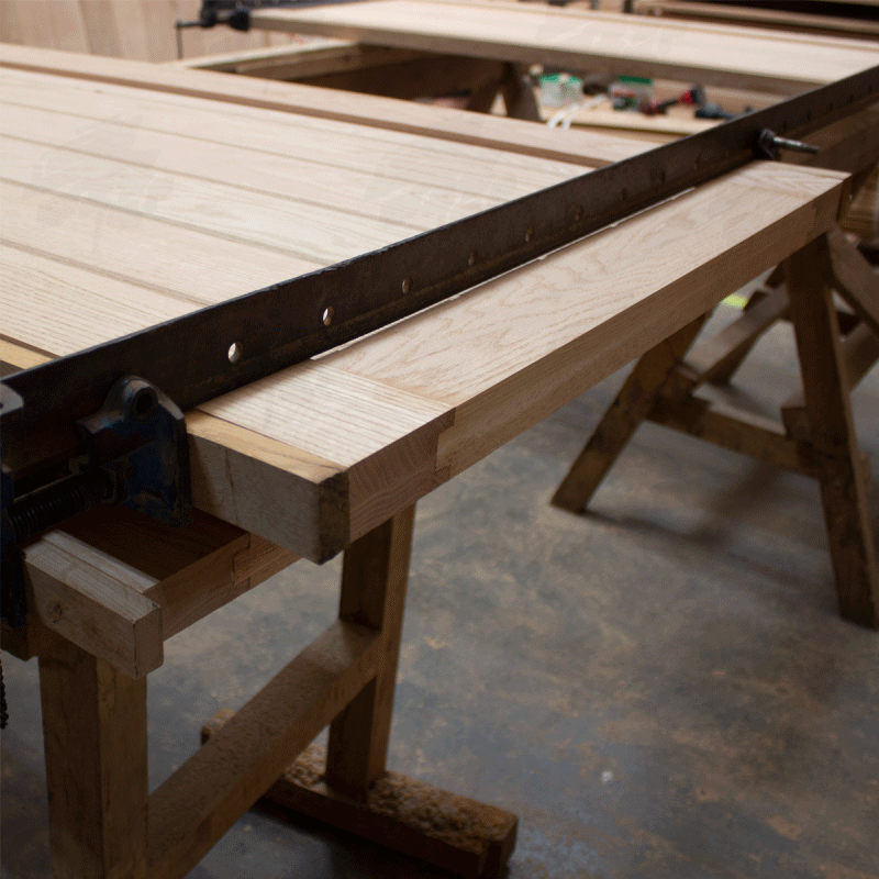All doors are 44mm thick, this comprises the main door of 20mm and the ledges of 22mm. The vertical 20mm boards have a micro bevel on the corners giving a V-Groove appearance and the external boards used for ledges, braced and frames are fixed with screws to the vertical boards and then wooden plugs are used to fill the screw holes.