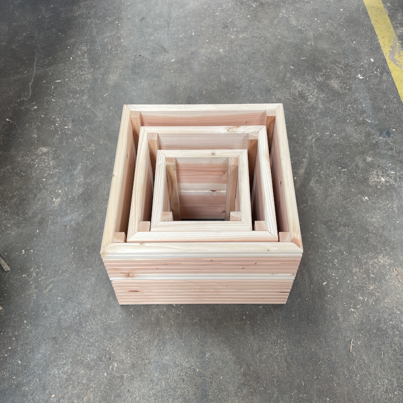 Being a sustainable sawmill and continuously developing products to ensure that waste material is kept to an absolute minimum, this nest of planters is handmade in our workshop by our carpenters using the offcuts of our high quality untreated English Larch/Douglas Fir decking boards. Each corner has been given additional stability with the insertion of a softwood stake and mitred to give a high quality clean linear appearance - these planters will truly stand the test of time.